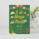 Mexican 5 de Mayo fiesta invitation with yellow, green, and red colours. Custom template you can personalise with your party details. Design featuring Mexico-themed illustrations including tacos, nachos, a hat, a cactus, a guitar, a bunting flag, and maracas.