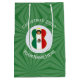Medium gift bag with an angel wearing the flag of Mexico for holiday gift decorating or Christmas decor. The Mexican Flag Christmas angel is found inside a white circular fractal of squiggly squares. The background is a green fractal of squiggly squares. Add your own text or personalise with a name and the year.