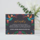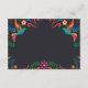 This Mexican Black Colourful Floral Nuestra Boda Wedding Enclosure Card bold and vibrant design features a deep black background that highlights the vivid colours of the surrounding floral and bird motifs. The colourful elements include bright oranges, purples, greens, and blues, with swirling vines, flowers, and birds framing the central area, giving it a lively and festive appearance. The contrast between the dark background and the radiant colours creates a striking, dynamic visual perfect for a modern and unique wedding stationery design.