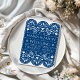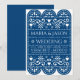 This Mexican Blue Papel Picado Folk Art Wedding Invitation design features an ornate and symmetrical layout inspired by papel picado, with intricate cut-out motifs of hearts, stars, florals, and swirling patterns. The rounded scalloped edges are richly detailed, while dotted lines divide the central space, making it perfect for inserting event information or personalised text. The overall effect is festive and romantic, ideal for invitations to weddings, parties, or cultural celebrations with a handcrafted charm.