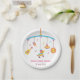Mexican fiesta themed baby shower supplies paper plates for a colourful celebration. It features a cute interpretation of crib toys with familiar Mexican elements such as a cute pinata donkey, a guitar, a maraca shaker, a sombrero hat and a cute sun with lots of music notes. A cheerful and bright design! Colour palette of blue, yellow, orange and pink. Personalise easily with your message in the text templates provided.
