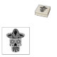 This awesome wood art stamp features a graphic design image of a Mexican Day of the Dead (Dia de los Muertos) inspired skull. The skull is a pale grey colour and is wearing a yellow sombrero. It has gold teeth and Mexican Sunflowers, also called Tithonias< instead of eyes. The sombrero has a cactus on it and is covered in pretty swirl patterns and red and green Chilli peppers. The skull itself is covered in pretty coloured flowers of different types.