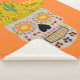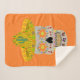 This awesome sherpa fleece blanket features a graphic design image of a Mexican Day of the Dead (Dia de los Muertos) inspired skull. The skull is a pale grey colour and is wearing a yellow sombrero. It has gold teeth and Mexican Sunflowers, also called Tithonias< instead of eyes. The sombrero has a cactus on it and is covered in pretty swirl patterns and red and green Chilli peppers. The skull itself is covered in pretty coloured flowers of different types.