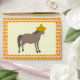 This envelope features a pale brown donkey with a dark brown mane and tail. The Donkey is ready to celebrate the Day of the Dead, Dia de los Muertos. The Donkey is wearing a sombrero covered in red and green stars, carrots, colourful swirls, cherries and red and green chillies. There is a flower with orange petals and a yellow centre in the middle of the hat, called a Tithonia, or Mexican sunflower.