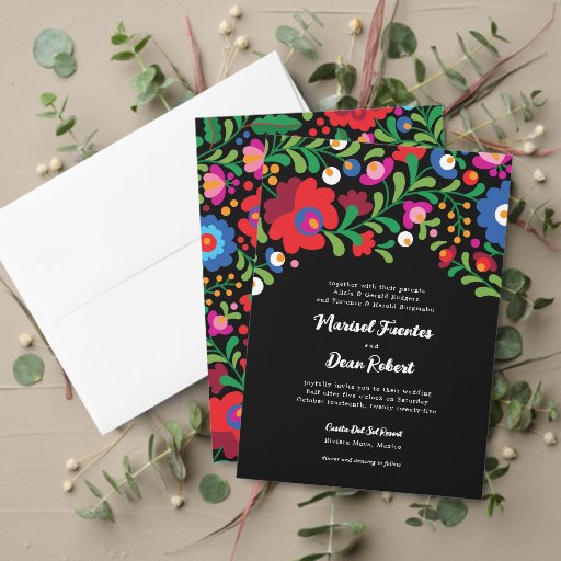 Perfect for a destination wedding invitation suite or just a Mexican themed celebration, this custom printed envelope features a pre-printed return address on the back flap and corner detail of flowers and foliage inspired by the colourful embroidery of native Mexican artisans.
