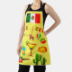 Kitchen apron with image of Mexican flag and other images of a fiesta against a yellow background.