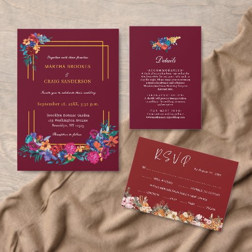 We love bright colours and bold designs, so we wanted something that would be fun and whimsical but still classy enough for a wedding. This design has an abundance of colourful flowers and modern typography on a burgundy background for a sophisticated floral look that would fit all year round weddings.