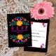 Colourful Mexican Fiesta Flowers on a black background. Suitable for any Mexican Fiesta themed party, this cheerful design features Floral Folk Art Flowers in Pink Red Purple and Yellow. The wording reads RSVP Please respond by [date] and the template is set up ready for you to add your own date. The back of the card has a white panel for your guests to add their name and indicate whether or not they are able to attend. For matching Quinceanera Invitations please browse our collection.