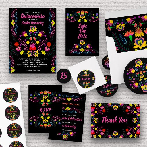Mexican Fiesta Party confetti personalised with your name, monogram and age. The design has a colourful floral design with Mexican folk art style flowers and papel picado, on a black background. The template is set up for you to personalise each of the 3 size pieces, all of which have a different design on the front and back. Please browse my store for coordinating Quinceanera party supplies and invitations.