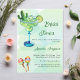 A green watercolored background decorated with watercolored cactus, a large green and blue glass with a Margerita coctail, colourful maracas Personalise and the name of the bride to be and details.