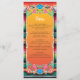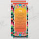 Mexican Fiesta wedding menu card with with decorative flowers and gold glitter (faux) accents on an Aztec rug background