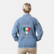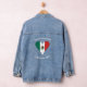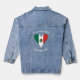 Design on women's denim jacket shows a funky shaped heart filled with the flag of Mexico. Above is a spot for a name to personalise. Below, add an occasion (for example Cinco de Mayo, birthday, reunion, etc.) and the year. Or, just add your own text. The Mexican flag is green, white, and red with an eagle in the centre. Great gift for mum on Mother's Day to honour her heritage. Cool to wear to family reunions, travel groups, and clubs.