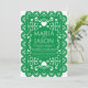 This Mexican Papel Picado Green White Folk Art Wedding Invitation design features a symmetrical, decorative green frame inspired by traditional papel picado or lace-cut patterns, often seen in festive or folk art settings. Intricate white cut-out motifs of hearts, flowers, and swirls embellish the border, creating an elegant and romantic feel. The scalloped edges are adorned with repeating petal-like and dotted shapes, making the design perfect for invitations, greeting cards, or festive announcements with a handcrafted charm.