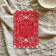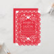 This Mexican Papel Picado Red White Folk Art Wedding Invitation design features a symmetrical, decorative red frame inspired by traditional papel picado or lace-cut patterns, often seen in festive or folk art settings. Intricate white cut-out motifs of hearts, flowers, and swirls embellish the border, creating an elegant and romantic feel. The scalloped edges are adorned with repeating petal-like and dotted shapes, making the design perfect for invitations, greeting cards, or festive announcements with a handcrafted charm.