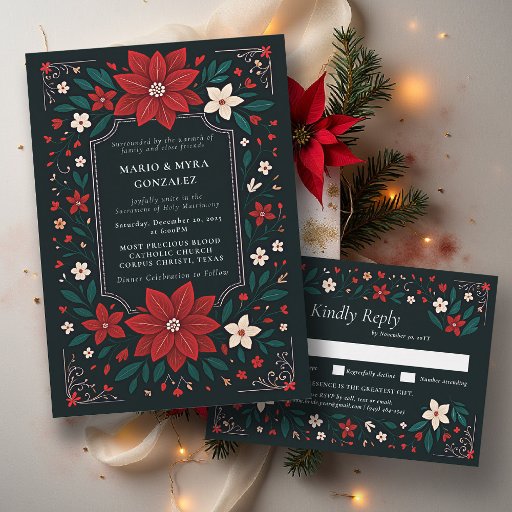 The Mexican Rustic Elegant Floral Christmas Wedding RSVP Reply Card (Invitation available) with a rustic elegant fiesta theme — a perfect blend of vibrant fiesta charm and timeless rustic elegance, designed for couples who want to celebrate their love with cultural flair. This church wedding at Christmas time features a stunning frame of red poinsettia flowers, this invitation set is perfect for couples who want to infuse their wedding with rich cultural charm and a touch of rustic beauty. The intricate floral design, combined with bright, vibrant tones, sets the stage for a celebration that's both festive and sophisticated. Ideal for a wedding full of warmth, tradition, and unforgettable moments.
