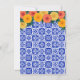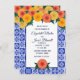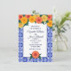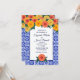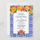 Mexican and Spanish-themed invitations with traditional blue tile in the background and bright yellow and orange marigolds.