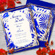 Our Mexican theme wedding save the date card draws inspiration from the rich tradition of Talavera blue and white colour tiles, presenting a stunning Talavera tile pattern framed by golden lines and specks. Against a soft and understated white backdrop, the calligraphy and serif typography add an air of sophistication, creating a perfect balance of elegance and bohemian charm. This card is an excellent choice for couples planning both Mexican theme weddings and destination weddings in Mexico.