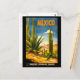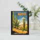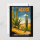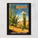 Great image from a vintage travel poster for Mexico with a cactus in the forefront and haciendas houses and flowers in the background.