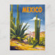 Restored and digitally enhanced vintage travel poster showing a cactus with a Mexican village in the background. Imperfections removed and colours corrected. Image courtesy of Library of Congress.