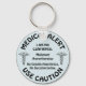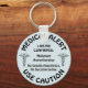 "MEDIC ALERT, USE CAUTION!" "I am MH confirmed." Malignant Hyperthermia: No Volatile Anesthetics, No Succinylcholine." Keychain in light blue with black text and imagery by Monkey Business Graphic Design.