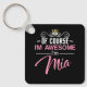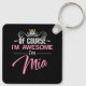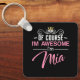 Of Course I'm Awesome I'm Mia -in mixed white and pink sans and cursive decorative font lettering with white scroll embellishments and topped a golden crown.