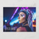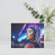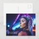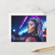 Photograph of a beautiful young woman in cyberpunk style at an outdoor EDM rave show in downtown Miami.