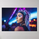 Photograph of a beautiful young woman in cyberpunk style at an outdoor EDM rave show in downtown Miami.