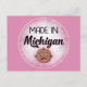 This funny postcard features a cute black baby face that says "Made In Michigan" on a Pink background. Perfect for new baby announcements or just for fun.