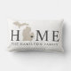 Stylish welcome pillow features a typography design with "Home" text and Michigan state map. The soft black / onyx heart city marker can be positioned over the city where you live via Customise. Personalise with your family monogram or your home town city name. Beige, soft black, and white colours. A pattern of horizontal stripes dresses up the back of the pillow.