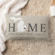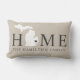Stylish welcome pillow features a typography design with "Home" text and Michigan state map. The soft black / onyx heart city marker can be positioned over the city where you live via Customise. Personalise with your family monogram or your home town city name. Beige, soft black, and white colours. A pattern of horizontal stripes dresses up the back of the pillow.