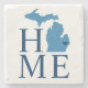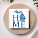 Stylish stone coaster features a typography design with "Home" text and Michigan state map. The navy blue heart city marker can be positioned over the city where you live via Customize. Navy, blue, and white colors.