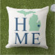 Stylish welcome pillow features "Home" text with Michigan state map. The navy blue heart city marker can be positioned over the city where you live via Customise. Navy blue, jade / mint green, and white colours. A pattern of horizontal stripes dresses up the back of the pillow.