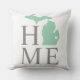 A Michigan Home outdoor pillow featuring the state silhouette in mint green with a small heart marking your hometown. Grey Home lettering on a clean white background creates a soft, calming state pride design, with coordinating mint and white stripes on the reverse. The heart can be repositioned over your specific Michigan city. A soothing accent for outdoor spaces.