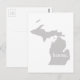 A postcard featuring the outline silhouette map shape of the Wolverine state of Michigan filled in solid grey with the word home inside.
