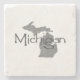 With the silhouette outline map shape of the state of Michigan with grey background and its name written across the front in black this simple Michigander stone coaster is a great reminder of your favourite state of Michigan while enjoying a tasty ice cold beverage and snack.