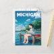 A young girl sits on a wooden dock, fishing rod in hand, enjoying a sunny day on a Michigan lake. Surrounded by lush green trees and a clear blue sky, she is enjoying a relaxing summer afternoon.