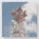 A red and white microwave telecommunications tower for microwave radio relay service stands backed by a blue sky and puffy white clouds in the countryside. Once used by the telephone companies to relay long distance calls, these towers are now useful in supporting newer telecom technologies such as cellular phone and wireless Internet service providers.