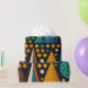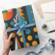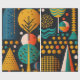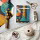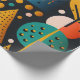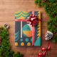 Unique abstract Christmas wrapping paper featuring a retro, geometric pattern of trees, circles, and triangles in a contemporary palette of teal, orange, mustard yellow, and dark gray.