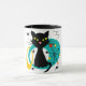 Colourful abstract Mid Century style illustration with black cat, black stars and colourful circles decoration on white background