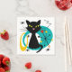 Colourful abstract Mid Century style illustration with black cat, black stars and colourful circles decoration on white background