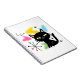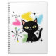 Colourful abstract Mid Century style illustration with black cat, black stars and colourful geometric shapes decoration on white background