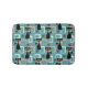 Colourful abstract Mid Century style pattern with black cat, black stars and colourful (blue, white, pink) cubes decoration on turquoise background for every cat lover, cat mum and cat dad.