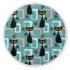Colourful abstract Mid Century style pattern with black cat, black stars and colourful (blue, white, pink) cubes decoration on turquoise background for every cat lover, cat mum and cat dad.