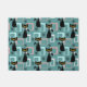 Colourful abstract Mid Century style pattern with black cat, black stars and colourful (blue, white, pink) cubes decoration on turquoise background for every cat lover, cat mum and cat dad.
