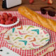 This is classic mid century modern boomerangs pattern with atomic starbursts in orange, pink, red , green and teal on light cream background. It's great looking paper plate for people who love atomic era designs.