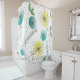 Mid-Century Modern Shower Curtain dandelion clocks, flowers and leaves in shades of yellow and blue on a white background.