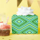 Wrapping paper in a mid-century modern, repeating diamond pattern in stripes of medium and light jade green and aqua, accented with black