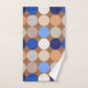 Towel set in a Mid-Century Modern geometric print of giant dots, in a grid of nine coordinating colours - shades of beige, cream, terracotta, light, medium and dark blue, on a taupe tan background