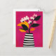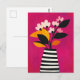 A bright fuchsia bouquet dances in a black-striped vase on a zesty yellow background—high-energy and eye-catching.