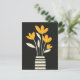 Mustard-coloured petals bloom from a solid black-striped vase, coolly offset by an aqua background.